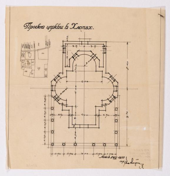 At the top left is an ink inscription: "Church project in Khlopy". In the lower right is an inscription in ink: "Lviv 29/IV/1933 engineer / signature / Yevhen Nahirnyi".