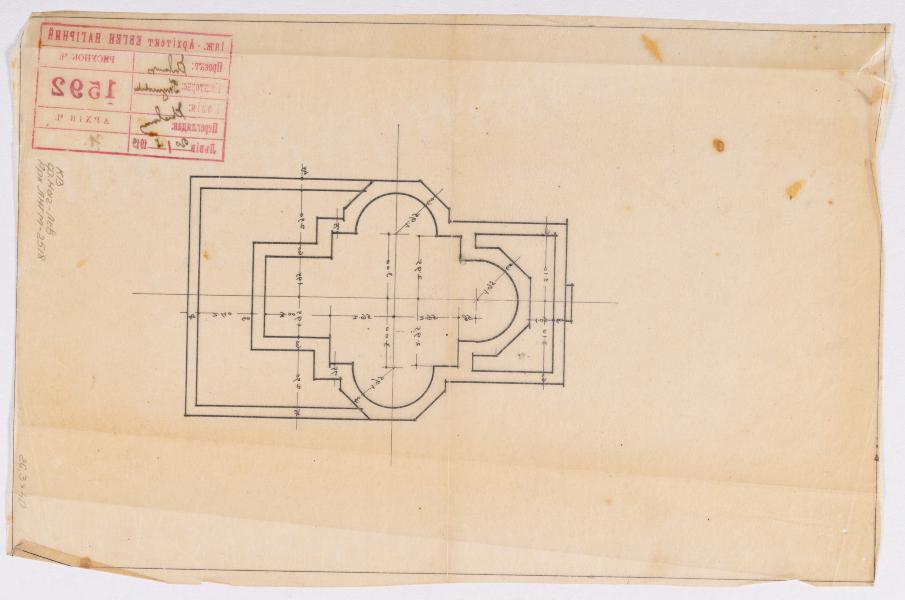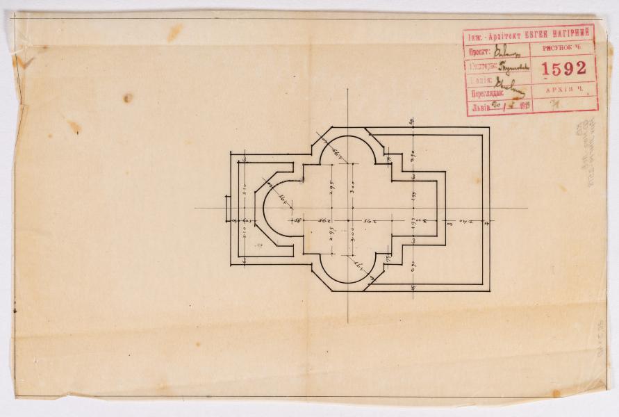 A plan of the foundations of the stone church of the Nativity of the Blessed Virgin Mary in the village of Khlopy (now the village of Peremozhne). This drawing belongs to the first design of the church from 1913. Some of the drawings were made in 1927 and 1933. The construction was finished in 1938. According to the drawings of 1913, the church was designed as a church with a centric plan, surrounded by arcades on three sides. The building was to have a hipped roof with a ridge turret above the crossing. However, the church was built differently, with a dome on a round tholobate (Lev Kh., Slobodian V., Filevych N. 100 Churches of the Nahirnyi family. Part Two: Churches of Yevhen Nahirnyi. Lviv, 2015. P. 108).