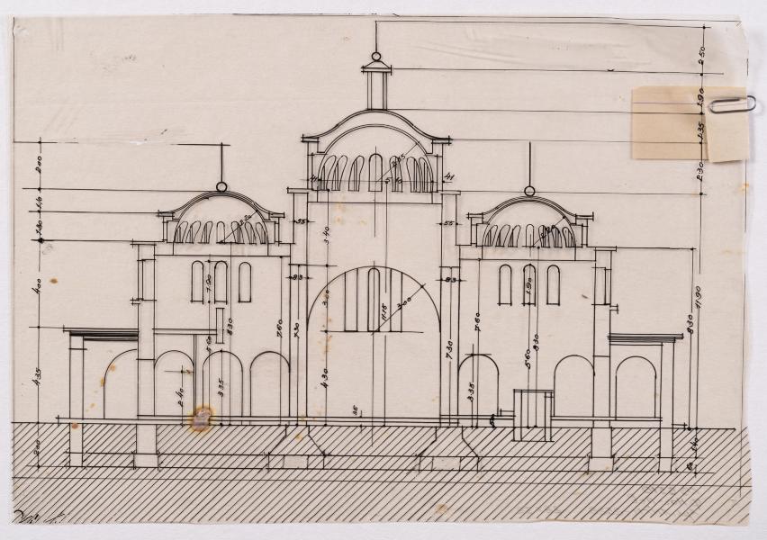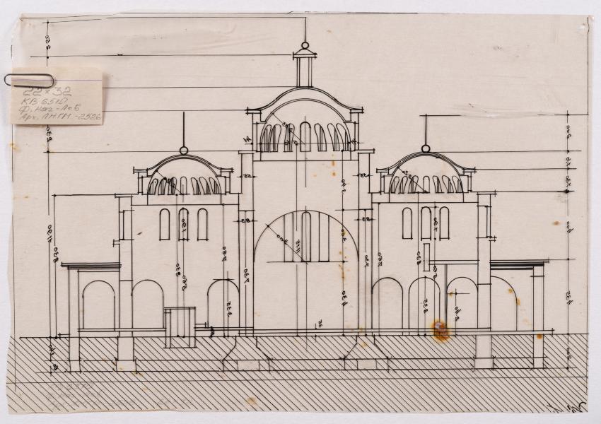 The drawing shows a cross-section of the projected church on Bohdanivka Street in Lviv (part of the modern Horodotska Street beyond the intersection with Lubinska and Kulparkivska Streets). Yevhen Nahirnyi designed the new large church in 1935. The building was to be located next to the wooden chapel of St. Andrew and St. Volodymyr, built in the first years after the First World War. The square neo-Byzantine building was to be symmetrical, with five domes surrounded by arcades. The architect proposed several project versions, differing in proportions, window shapes, and decorative elements. This facade drawing is one of the most slender and minimalist versions.