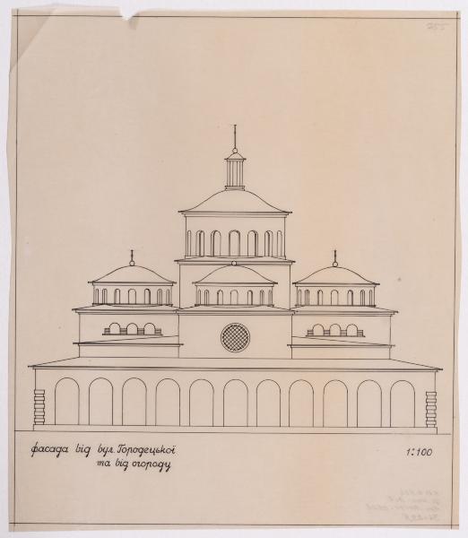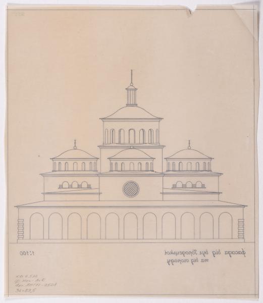 The drawing shows the side facade of the projected church on Bohdanivka Street in Lviv (part of the modern Horodotska Street beyond the intersection with Lubinska and Kulparkivska Streets). Yevhen Nahirnyi designed the new large church in 1935. The building was to be located next to the wooden chapel of St. Andrew and St. Volodymyr, built in the first years after the First World War. The square neo-Byzantine building was to be symmetrical, with five domes surrounded by arcades. The architect proposed several project versions, differing in proportions, window shapes, and decorative elements. This facade drawing corresponds to a more elevated version in which an avant-corps accentuates the entrance, and rustication is used in the decoration.