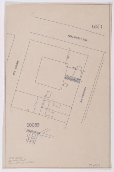 A site plan of the proposed church between Tserkvovna (now Uliana Kravchenko), Horodotska and Liudova (now Narodna) streets in Lviv, drawn by Yevhen Nahirnyi in 1935. The location of the church on the site is shown, and the chapel of St. Andrew and St. Volodymyr, which existed at the time, is marked.