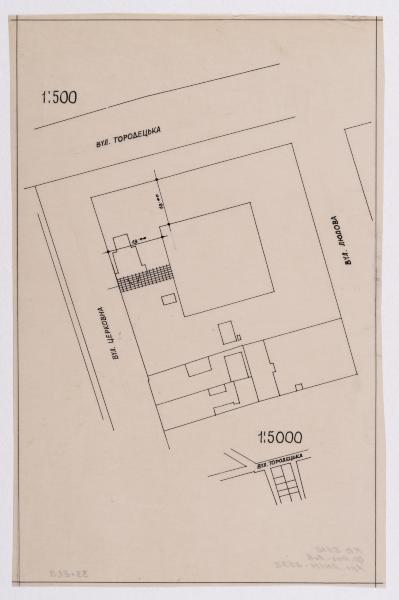 The situational scheme has ink inscriptions: "1:50", "Tserkvovna Street", "Horodetska Street", "Liudova Street", "1:5000".
