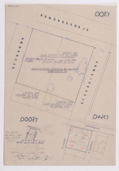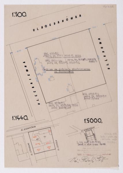An extract from the cadastral plan of Lviv at the scale of 1:1440 is shown. It was used to create site plans of the church construction site at scales of 1:500 and 1:5000. The wooden chapel of St. Andrew and St. Volodymyr, which existed at the time, is marked, as well as the neighbouring private plots between Tserkovna (now Uliana Kravchenko), Bohdanivka (now part of Horodotska), and Ludowa (now Narodna) streets. The drawings were made in August 1935 by Rudolf Polt, a government-authorised civil engineer, civil "geometer" (geodesist), and forensic building expert.