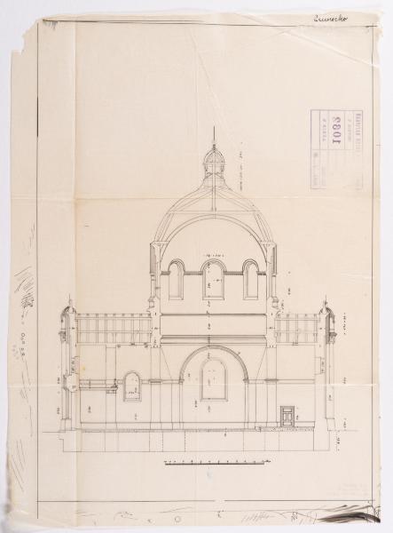 A longitudinal section of the church is depicted. It is a single-nave brick building with a transept, a rectangular nave, and a small sacristy. A dome topped with a hemispherical cupola rises above the transept. It is decorated in the neo-Byzantine style: the facades have thin arched recesses, and the cornices are decorated with lesenes. The corners of the building are accentuated by thin towers in the thickness of the wall, square at the bottom and octagonal at the top. This is a typical example of a small village church by Vasyl Nahirnyi, and this drawing is probably a copy made by Yevhen Nahirnyi. The date of the drawing is unknown, and the project was never realised (Lev Kh., Slobodian V., Filevych N. 100 Churches of the Nahirnyi family. Part One: Churches of Vasyl Nahirnyi. Lviv, 2013. P. 128).