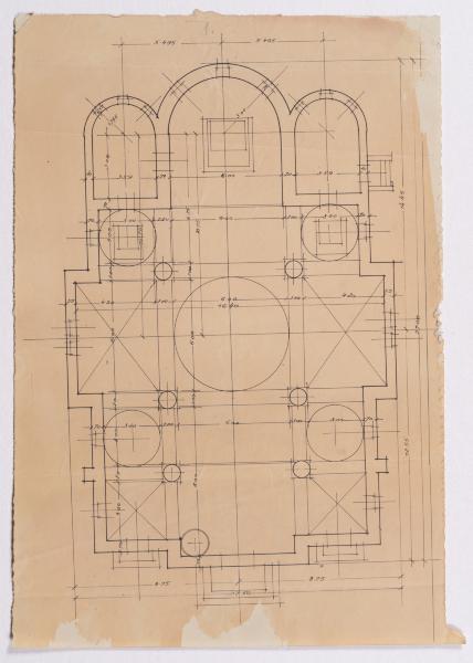 The drawing shows the plan of a brick church. It is a three-nave building with three entrances, a transept, three arches, and three altars. The abysses are semicircular, the transept frames are rectangular and only slightly protruding. The church has five domes: a large one above the transept and four smaller ones along the diagonals. An identical plan is shown in a drawing with the inventory number "ФНаг-Лев-Арх-2576".