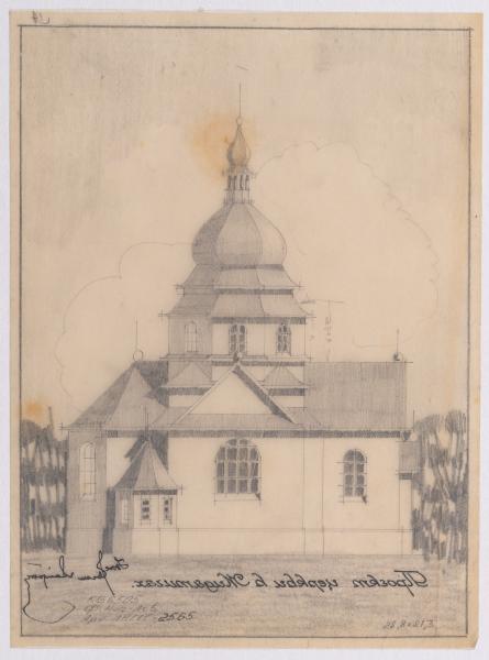 The drawing shows the side facade of the church in the village of Zhydiatychi, renamed Hamaliyivka in 1946. It is a simple one-nave building with a transept, a facetted abyss, a dome over the transept, and a Baroque-style octagonal dome with several sections. The facades are finished off with triangular pediments. The church also has two sacristies, designed as facets but built as rectangles. It was built between 1929 and 1932. Today, it is the Church of St. Nicholas of the Ukrainian Greek Catholic Church (Lev Kh., Slobodian V., Filevych N. 100 Churches of the Nahirnyi family. Part Two: Churches of Yevhen Nahirnyi. Lviv, 2015. P. 85).