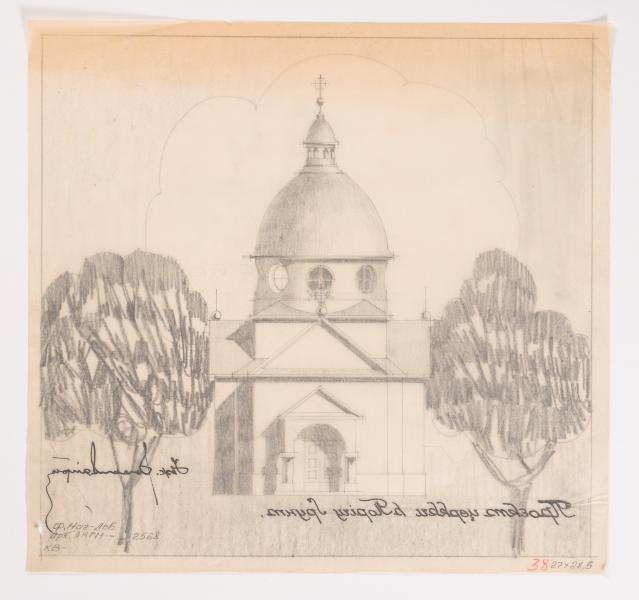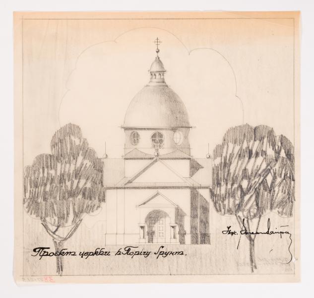 The main facade of the church project for the village of Porichchia-Hruntove is shown. It is a single-nave brick church with a transept, a semicircular apse with sacristies along the perimeter, and a single-storey building with a hemispherical dome above the crossing. A portal with a roof on two columns stands out among the decorative elements. The project was never realised (Lev Kh., Slobodian V., Filevych N. 100 Churches of the Nahirnyi family. Part Two: Churches of Yevhen Nahirnyi. Lviv, 2015. P. 127).