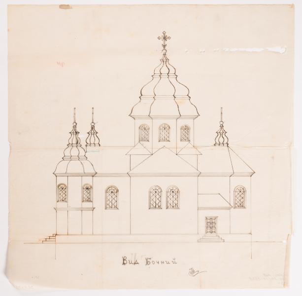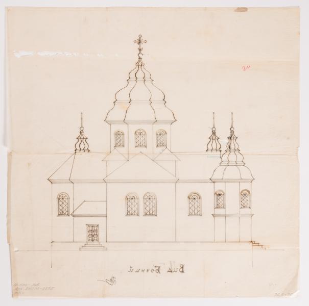 A sketch of a side facade of an unidentified church is depicted. It is a brick single-nave building with a transept and a faceted apse. A baroque cupola with creases rises above the crossing. Three towers have similar but smaller finishes – two at the main facade and one above the sacristy. The same church is depicted on drawings with inventory numbers "ФНаг-Лев-Арх-2573", "ФНаг-Лев-Арх-2574" and "ФНаг-Лев-Арх-2576".
