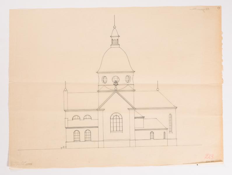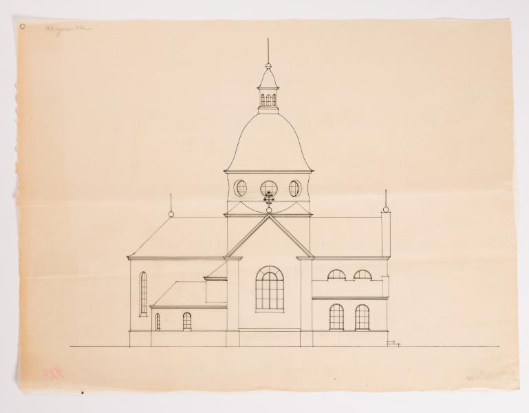 The side facade of the church project for the village of Avhustivka, probably in the Ternopil region. It was completed in September 1933 and is similar to the church's design for the Radokhyntsi village, designed at the same time by Yevhen Nahirnyi. It is a single-domed basilica with a prominent transept and three semicircular apses. The two projects differ in size and decoration: the church in Avhustivka is slightly smaller, it has triangular pediments instead of curved ones, and the dome over the crossing is bell-shaped on a cylindrical tholobate instead of hemispherical on an octagon. The project was never realised.