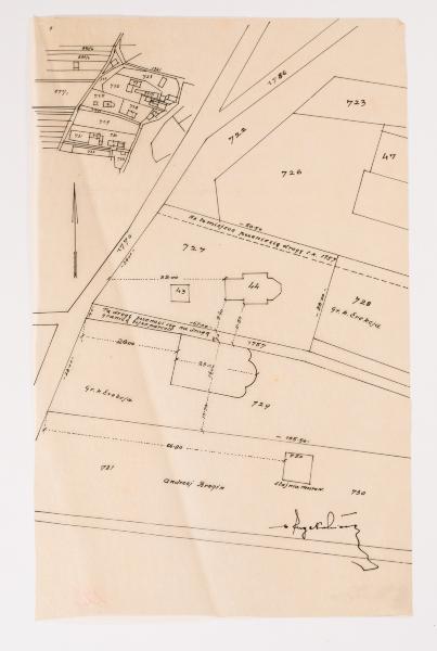 The plot numbers and the plot owned by the Greek Catholic Church are signed in ink on the map: "Gr. k. Erekcja" [Gr. k. Erection]. The projected relocation of the road is marked: "Na to miejsce przeniesię drogę l. k. 1757" [the road will be moved to this place] (written in Polish with errors); "Tą drogę przenosi się na drugą granicę tejże parceli" [this road is moved to the second border of this parcel]. Signed by the author at the bottom right: "/ Eug. Nahirnyi /".