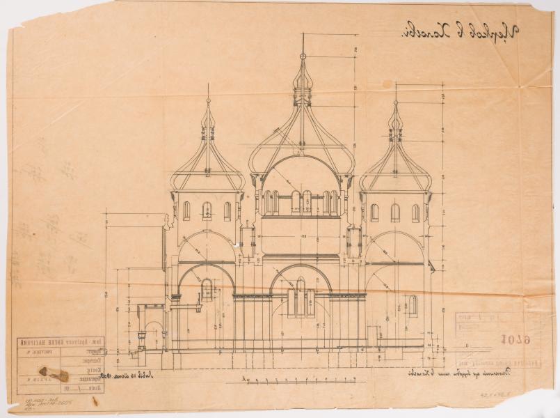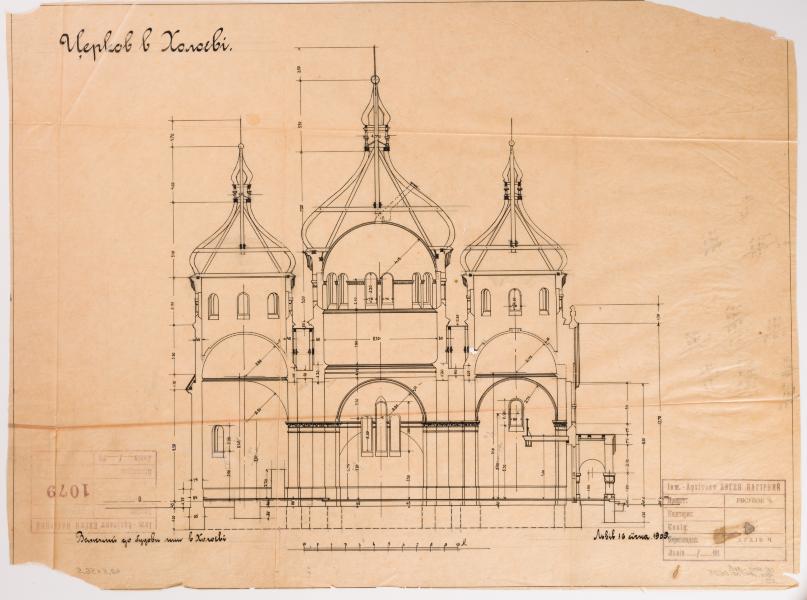 A longitudinal section of the church project for the village of Kholoiiv, now the village of Vuzlove, is shown. Vasyl Slobodian attributes the design to Vasyl Nahirnyi and points out that the church built in 1909 was later destroyed. In this case, the drawing is a copy by Yevhen Nahirnyi. The church is of brick, cruciform in plan, with two sacristies and is crowned by three onion-shaped cupolas. It is very similar to a later project for a church in the village of Pyniany, which was never built. It probably also included half domes above the transept frames, which are not visible in the section. The projects differ in that the Kholoiiv church had a designed porch – arcades around the babynets (Lev Kh., Slobodian V., Filevych N. 100 Churches of the Nahirnyi family. Part One: Churches of Vasyl Nahirnyi. Lviv, 2013. P. 128).