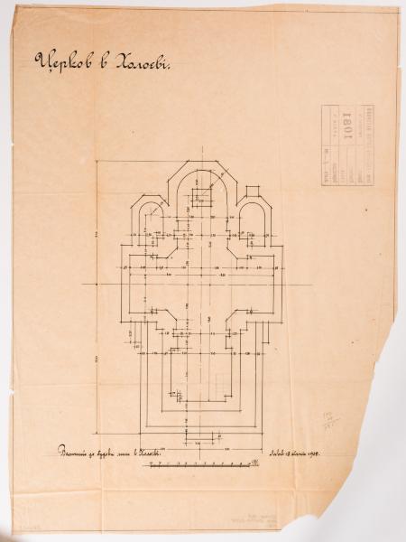 A plan of the foundations from the church project for the village of Kholoiiv, now the village of Vuzlove, is shown. Vasyl Slobodian attributes the design to Vasyl Nahirnyi and points out that the church built in 1909 was later destroyed. In this case, the drawing is a copy by Yevhen Nahirnyi. The church is of brick, cruciform in plan, with two sacristies and is crowned by three onion-shaped cupolas. It is very similar to a later project for a church in the village of Pyniany, which was never built. It probably also included half domes above the transept frames, which are not visible in the section. The projects differ in that the Kholoiiv church had a designed porch – arcades around the babynets (Lev Kh., Slobodian V., Filevych N. 100 Churches of the Nahirnyi family. Part One: Churches of Vasyl Nahirnyi. Lviv, 2013. P. 128).