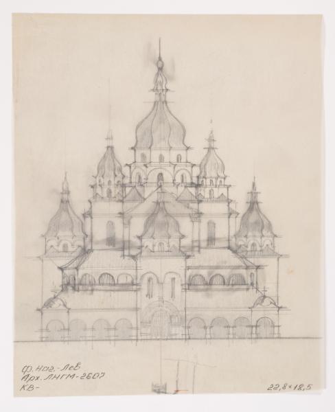 This is a sketch (a side facade) of a large brick church combining Byzantine and Baroque influences. The building has a complex plan based on a square with three faceted apses and an attached narthex. It is surrounded by an arcade to the west. An arcade also surrounds the central apse. Nine domes of different heights crown the church. It is unknown if this sketch was used as the basis for a project to build the church or if the idea was ever realised.