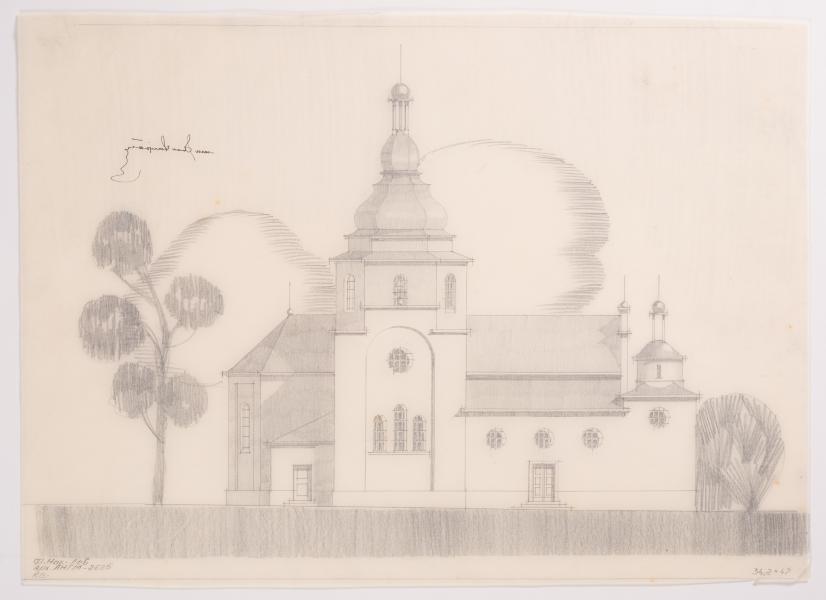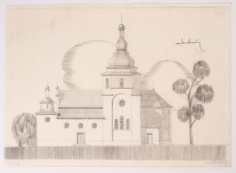 The drawing depicts the side (southern) facade of the brick church in the Art Deco style, combining elements of historic styles and modernist influences. Its plan is traditional and cruciform, with an elongated nave, a slightly projecting transept, and a faceted apse. The building is asymmetrical: the entrance is through an irregular portico with six columns, offset to the left; to the right of the main entrance is a staircase leading to the choir gallery, and a turret completes this volume. Above the transept is an octagonal tower topped by a Baroque corrugated roof. The facades have porthole windows. This project was probably designed for a town, not a village. Also, made at the end of 1938, it probably had no chance of being carried out due to the imminent outbreak of the Second World War.