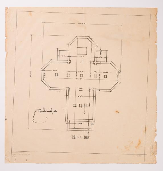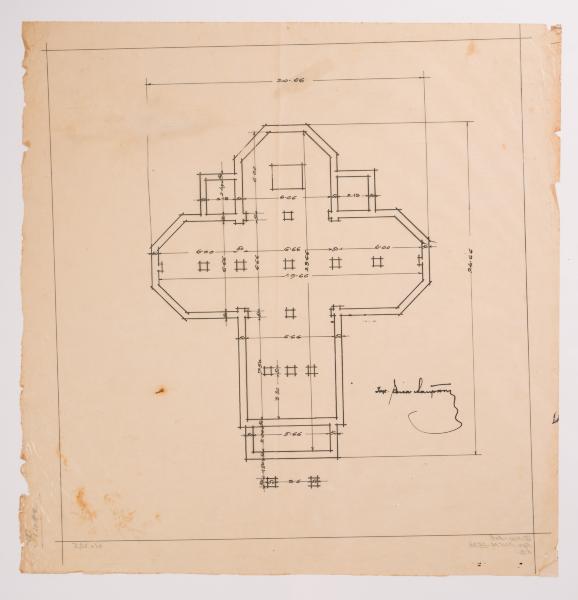 A plan of the foundations of the planned wooden church is shown. It is a cruciform building with facetted transept sides, an apse, and an elongated rectangular babynets. Above the transept is a dome, an octagon on a quadrangle, topped by a Baroque onion-shaped cupola with creases. It is surrounded by four octagons of similar but smaller shape. The entrance to the church is through a portal with a curved pediment, the shape of which is influenced by the Art Deco style. It was designed in 1931 and built the following year (Lev Kh., Slobodian V., Filevych N. 100 Churches of the Nahirnyi family. Part Two: Churches of Yevhen Nahirnyi. Lviv, 2015. P. 94).