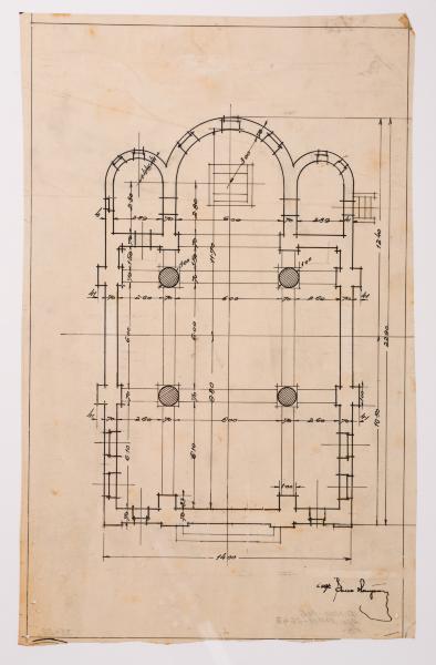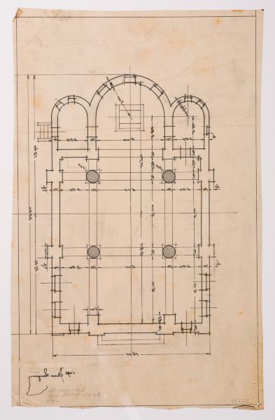 The plan of the projected church is shown. It is a three-nave building with three apses, four pillars, and one dome. A bell-shaped dome on an octagon rises above the crossing. The facades are completed with triangular pediments. The decoration uses restrained Art Deco forms. The project was drawn up in the 1920s, and it is not known whether it was ever built. The same church is shown in the drawings with inventory numbers "ФНаг-Лев-Арх-2645", "ФНаг-Лев-Арх-2646", "ФНаг-Лев-Арх-2647", "ФНаг-Лев-Арх-2649", "ФНаг-Лев-Арх-2650".