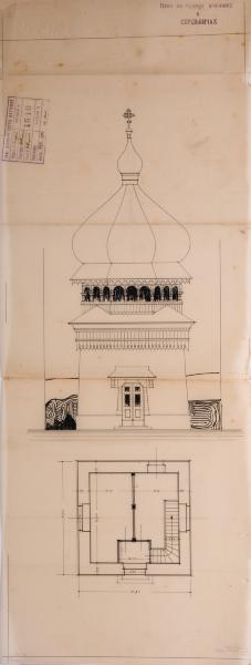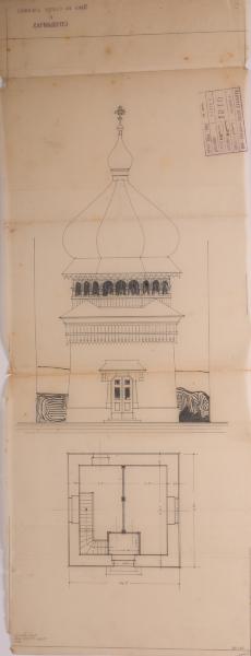 Plan and facade of the projected bell tower for Strilbychi. The building is square and has two levels. The first level is made of stone, and the second is made of wood. The wooden octagon is covered with a baroque-shaped tented roof. The bell tower was completed and still exists today (2024).