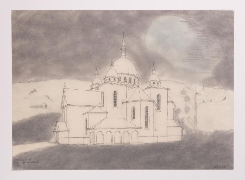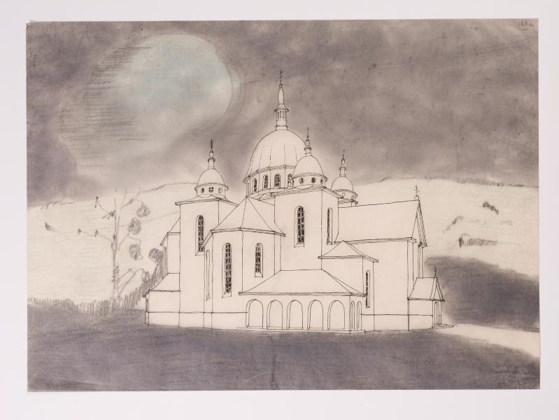 The perspective of a large five-domed church is shown, which in its three-dimensional solution is very similar to the sketch of the church in Deliatyn but differs in details. It is a single-nave cruciform building with elongated rectangular babynets, facetted transept sides, and a semicircular apse. It is five-domed. The dome over the crossing is large, on a multifaceted tholobate. There are four smaller ones on the diagonals, which have a baroque bell shape with creases. Unlike the Deliatyn church, the entrance is not through a columned portico but through a small porch, and there are also symmetrical arcades-porches.