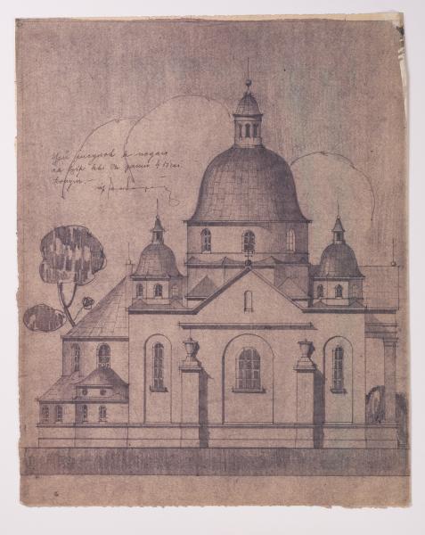 The side facade of the five-domed brick church, which has a square plan (with four interior columns) and three semi-circular apses, is shown. The entrance is through a columned portico crowned with a pediment. The domes are bell-shaped. The design combines Classicist and Baroque influences. The drawing dates from the 1920s.