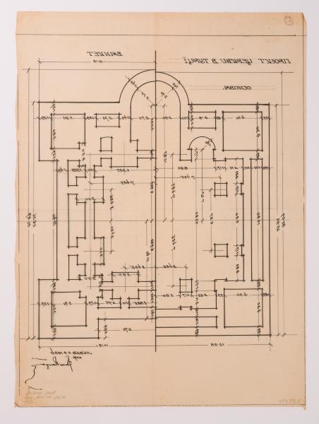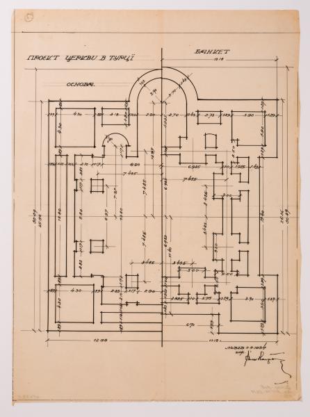 The drawing depicts a plan of the foundations of a large stone church for the town of Turka in the Lviv oblast, which was never built. The drawing is divided into two parts: on the right is a plan made at the level of the foundation footing ("banquettes"). The church was designed in 1927, and most drawings, including this one, were made in 1934. The building is based on a square plan with a semicircular apse and eight columns supporting a large central dome in the interior. At the corners of the building are four more towers crowned with bell-shaped domes. Between the towers on three sides of the building are arcade porches with low columns. There are two versions of the building, which differ in decoration, including the decoration of the domes (Lev Kh., Slobodian V., Filevych N. 100 Churches of the Nahirnyi family. Part Two: Churches of Yevhen Nahirnyi. Lviv, 2015. P. 128).