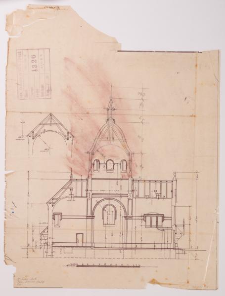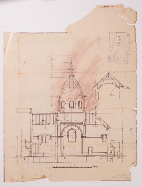 A longitudinal section of the projected church is shown, which is similar in structure, size and shape of windows to the one depicted in the works with inventory numbers "ФНаг-Лев-Арх-2674" and "ФНаг-Лев-Арх-2675". It is a single-nave, single-domed brick church with a transept. This drawing is distinguished by a rounded instead of a facetted apse, a bell-shaped dome instead of a tented one on a cylindrical tholobate instead of an octagon. A note on the drawing gives the names of several villages for which this type of church was probably planned. However, the only town where something similar was built is Kudobyntsi. Vasyl Slobodian identifies the church in this village as designed by Vasyl Nahirnyi and built in 1927 (Lev Kh., Slobodian V., Filevych N. 100 Churches of the Nahirnyi family. Part One: Churches of Vasyl Nahirnyi. Lviv, 2013. P. 129).