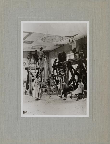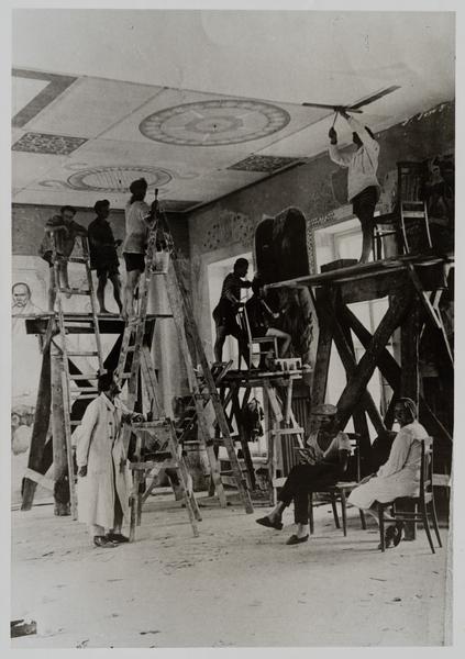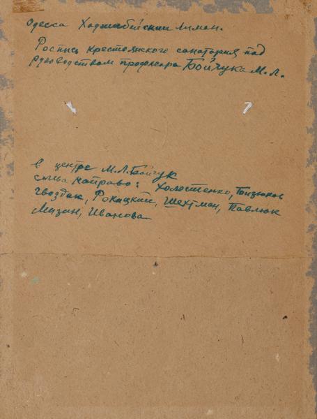 Згідно з російськомовним написом на звороті фотографії, виконаним синім чорнилом, тут зображено епізод з робочого процесу – виконання монументальних розписів у приміщенні Селянського санаторію ім. ВУЦВК на Хаджибейському лимані біля Одеси (1927–1929 рр.). Підписи зображених осіб надано відповідно до напису на звороті (виконаному наразі невстановленою особою). На зображенні чотири особи на двох риштуваннях (троє на лівому, одна – на правому) виконують декоративні розписи на стелі (стилізовані класичні орнаменти). Ще одна група митців виконує розписи у проміжку між вікнами (затемненість фотовідбитка не дозволяє встановити, що саме там зображено). У глибині композиції на стіні – частина прорису майбутнього розпису, на якому в одній з груп зображено оплічний портрет Тараса Шевченка (існує схожий за стилістикою рисунок Михайла Бойчука, виконаний, імовірно, на початку 1910-х рр., зберігається у Галереї).