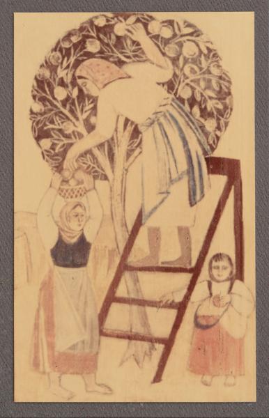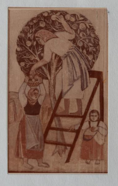 Українськомовний напис простим олівцем під фотографією свідчить: «Іванова А. Ескіз килимка “Збір яблук” Київ, Святошино» (вказівка на рік виконання відсутня). Сюжет цієї роботи доволі типовий для іконографії практик художників кола Михайла Бойчука (наприклад, робота Миколи Рокицького «Яблуня», 1923, НМЛШ чи робота Михайла Бойчука «Під яблунею» («Двоє під яблунею»), 1912–1913, з колекції Галереї) як за манерою виконання, так і за тематикою. Загалом площинність та трактування сцени, суголосна практикам сакрального мистецтва, передусім православного іконопису, є однією з важливих характеристик формального вирішення цієї роботи художниці. З огляду на вказане місце створення та підхід до трактування образів, можна припустити, що робота належить до початку 1920-х рр., коли Антоніна Іванова переважно працювала у Києві та області.