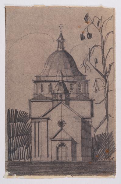 Рисунок церкви в селі Дмитрів Радехівського району Львівської області. Проєкт реконструкції церкви Воздвиження Чесного і Животворящого Хреста був створений архітектором у 1936 р., реалізований у 1939 р. (Лев Х., Слободян В., Філевич Н. 100 церков Нагірних. Частина друга: Церкви Євгена Нагірного. Львів, 2015. С. 125).
