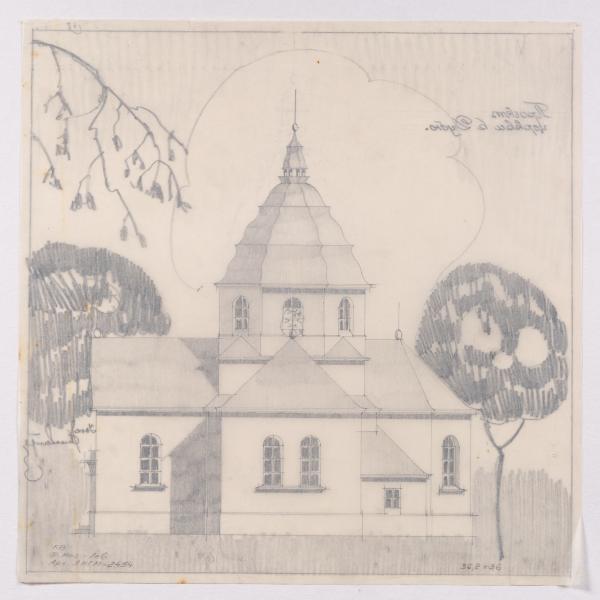 Вгорі ліворуч напис, виконаний простим олівцем: «Проект церкви в Дубю». Праворуч підпис, виконаний простим олівцем: «інж. / підпис / Євген Нагірний».