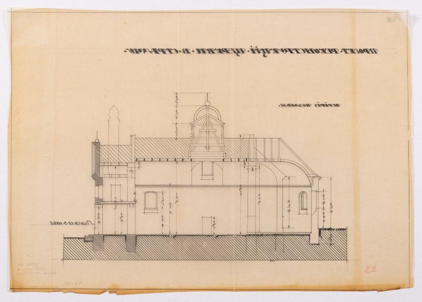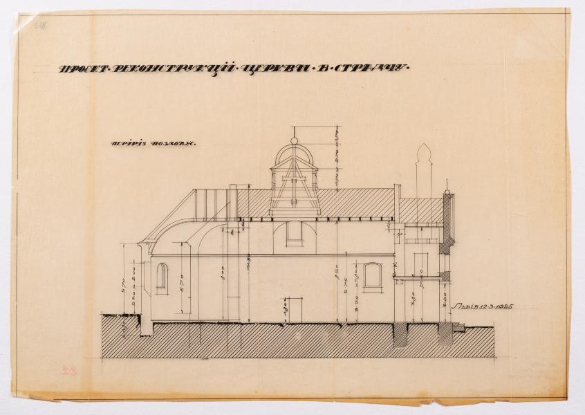 Зверху від креслення напис тушшю: «Проект реконструкції церкви в Страдчу». Зліва вище напис тушшю: «Переріз поздовж.», справа знизу напис тушшю: «Львів 12.3.1925».