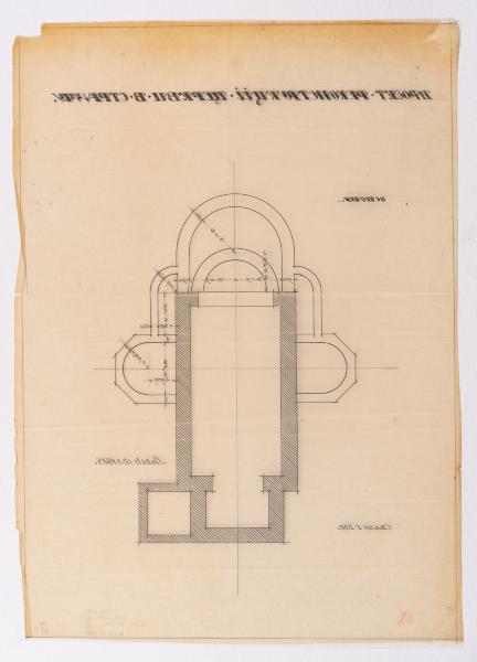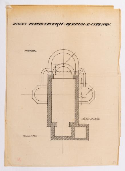 На рисунку зображений план фундаментів церкви Успіння Пресвятої Богородиці у селі Страдч. Зведена у 1795 році, церква була мурованою однонавовою будівлею з невеликою півциркульною апсидою. Будівля була понищена під час Першої світової війни. 1925 року Євген Нагірний створив проєкт відбудови церкви з її розширенням. Так були додані дві бічні каплиці, захристії, хори та сходи на них, збільшена вівтарна частина, а поруч на території була запроєктована мурована стінна дзвіниця. Будівля зберегла свій первинний стриманий вигляд ззовні, проте додатки були декоровані у стилі артдеко. Проєкт реалізований у 1925–1927 роках. Церква збережена донині (2024) (Лев Х., Слободян В., Філевич Н. 100 церков Нагірних. Частина друга: Церкви Євгена Нагірного. Львів, 2015. С. 128).