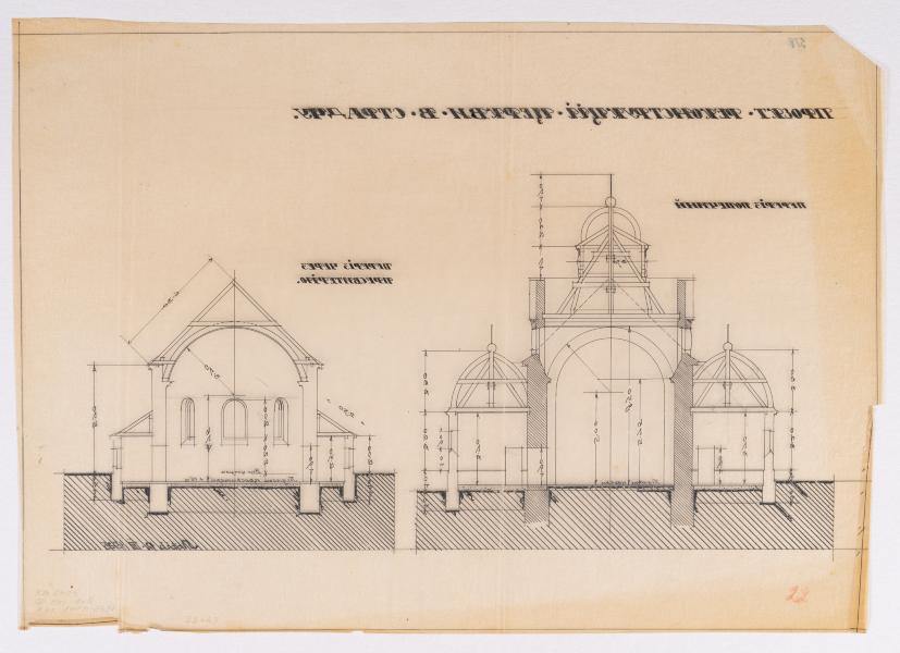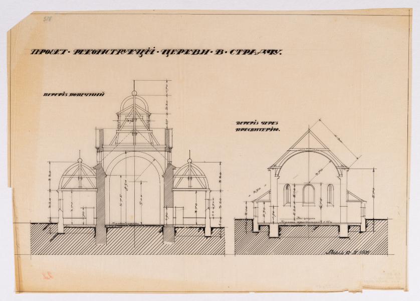 Зверху від креслення напис тушшю: «Проект реконструкції церкви в Страдчу». Зліва нижче напис тушшю: «Переріз поперечний», посередині зверху напис тушшю: «Переріз через пресвітерію», справа знизу напис тушшю: «Львів 12.III.1925».