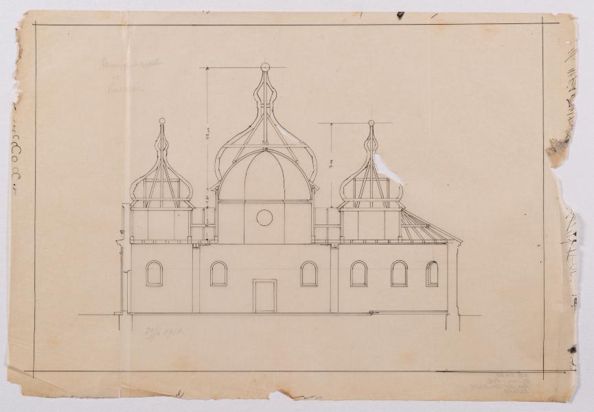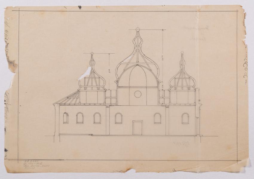 Зліва згори напис олівцем, ледве помітний: «Реконструкція церкви в Комарнї».