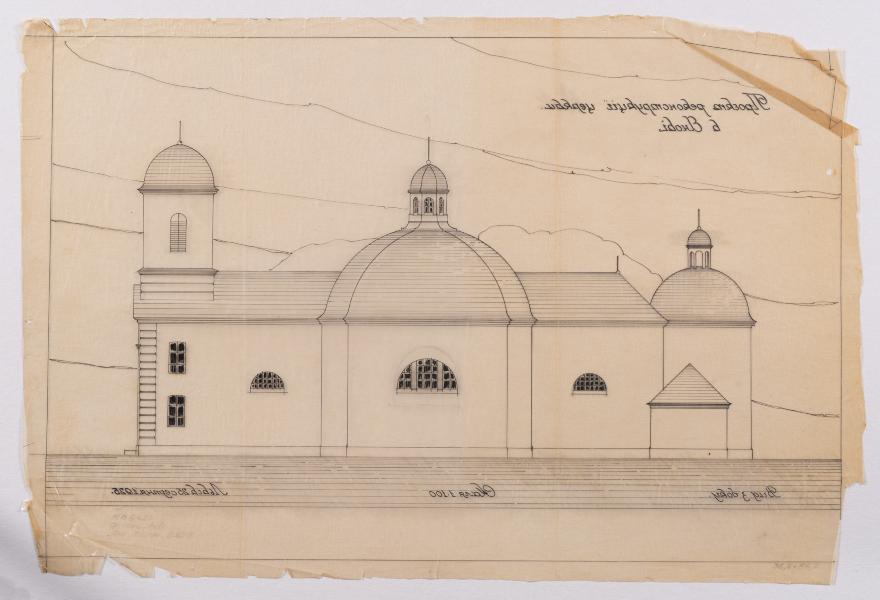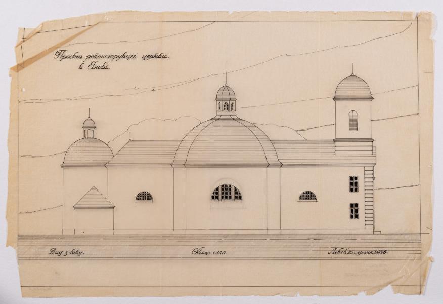Зліва згори напис тушшю: «Проект реконструкції церкви в Янові». Знизу креслення написи тушшю. Зліва: «Вид з боку», посередині: «Скаля 1:100», справа: «Львів 25 серпня 1925».