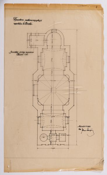 Зліва згори напис тушшю: «Проtкт реконструкції церкви в Янові», нижче напис тушшю: «Знимка мету поземого / Скаля 1:100», справа знизу напис тушшю: «Львів 8.V.1931 Інж. / підпис / Євген Нагірний».