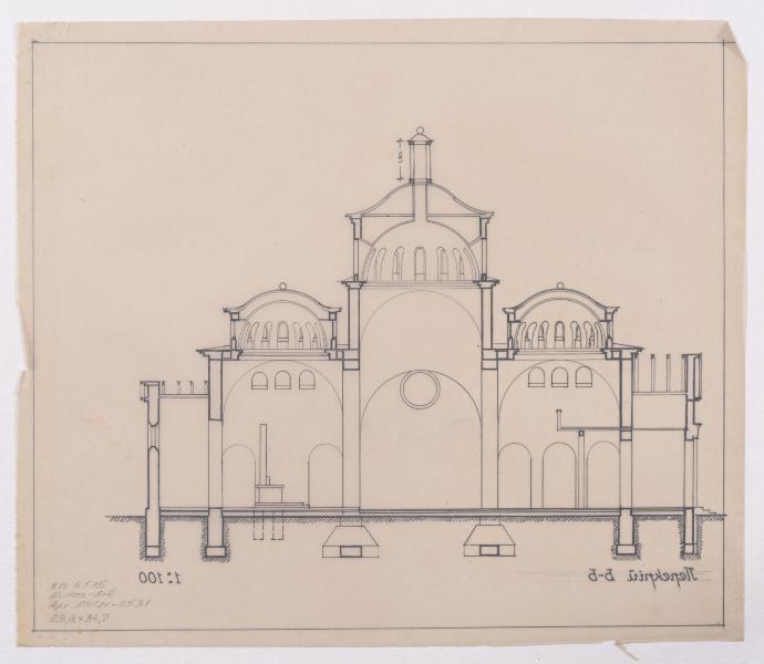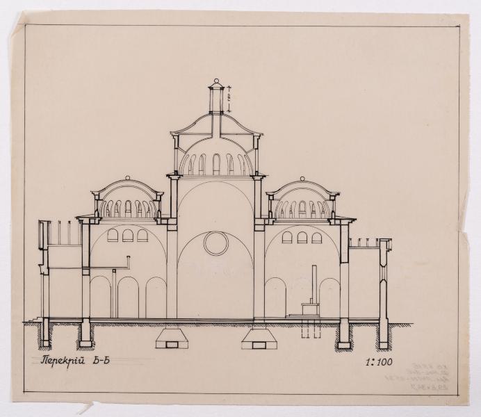 На кресленні зображений розріз проєктованої церкви на вулиці Богданівка у Львові (частина сучасної вулиці Городоцької поза перехрестям з Любінською та Кульпарківською). Євген Нагірний виконав проєкт нової великої церкви 1935 року. Будівлю мали розмістити поруч із дерев’яною каплицею св. Андрія і Володимира, зведеною у перші роки після Першої світової війни. Квадратна у плані неовізантійська будівля мала бути симетричною, з п’ятьма куполами, оточеною аркадами. Архітектор запропонував кілька версій проєкту, що різняться пропорціями, формою вікон та застосуванням декору. Це креслення фасаду відповідає більш високому варіанту, де вхід заакцентований ризалітом, а в декорі застосований руст. Розріз зроблений через головний вхід і вівтарну частину.