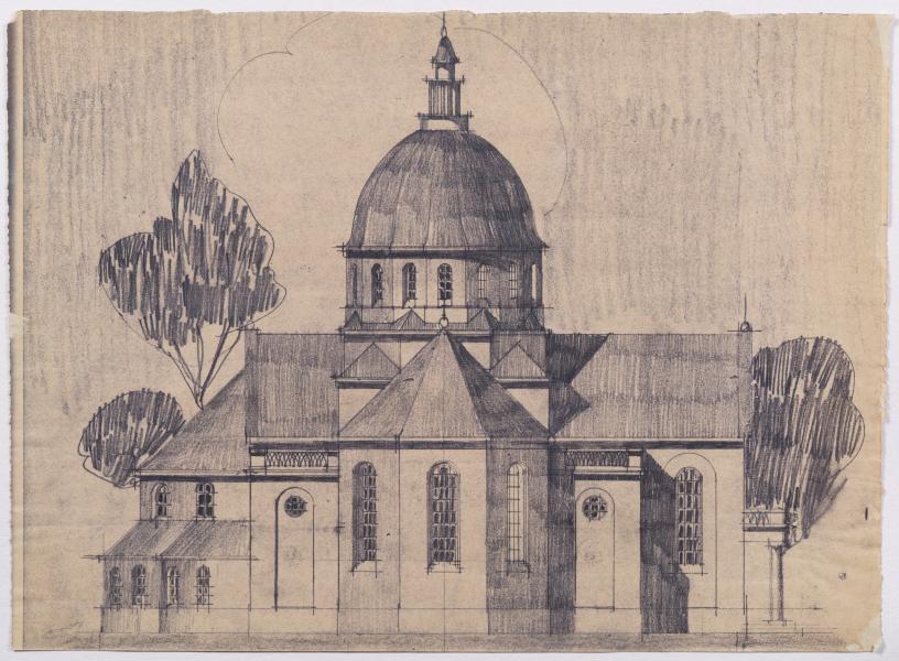 Зображений бічний фасад проєктованої церкви. За об’ємно-просторовим вирішенням будівля подібна на нереалізований проєкт церкви у Делятині (робота з інвентарним номером «ФНаг-Лев-Арх-2566»): обидві хрещаті, з півциркульними абсидами, гранчастими раменами трансепта, нави розширені каплицями з обох боків, а вхід влаштований через колонний портик, що завершений балконом. Основна відмінність двох проєктів полягає в тому, що Делятинська церква – п’ятиверха, з заламаними бароковими завершеннями бань, а ця – одноверха, з півсферичною банею над середохрестям. Можливо, це два варіанти для Делятина.