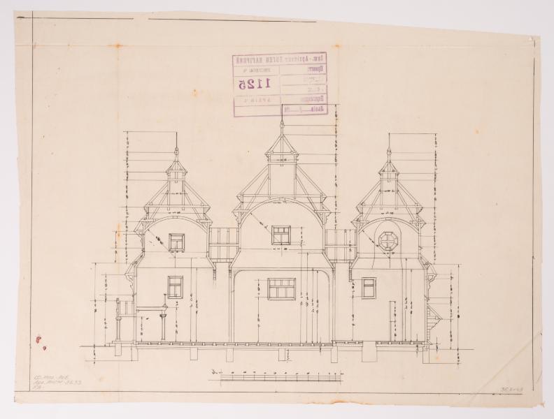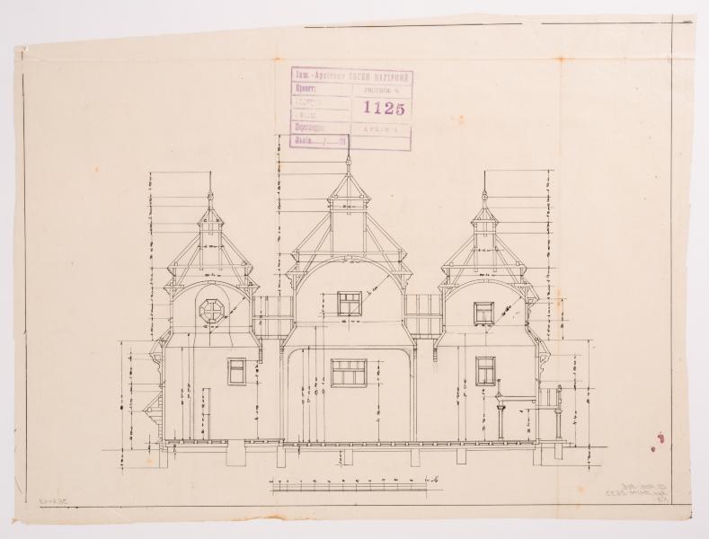 Зображений поздовжній розріз тридільної дерев’яної церкви. Три бані накриті шатровими дахами з заломами. Проєкт виконаний, ймовірно, до Першої світової війни. На роботі з інвентарним номером «ФНаг-Лев-Арх-2634» зображений план фундаментів цієї ж церкви.