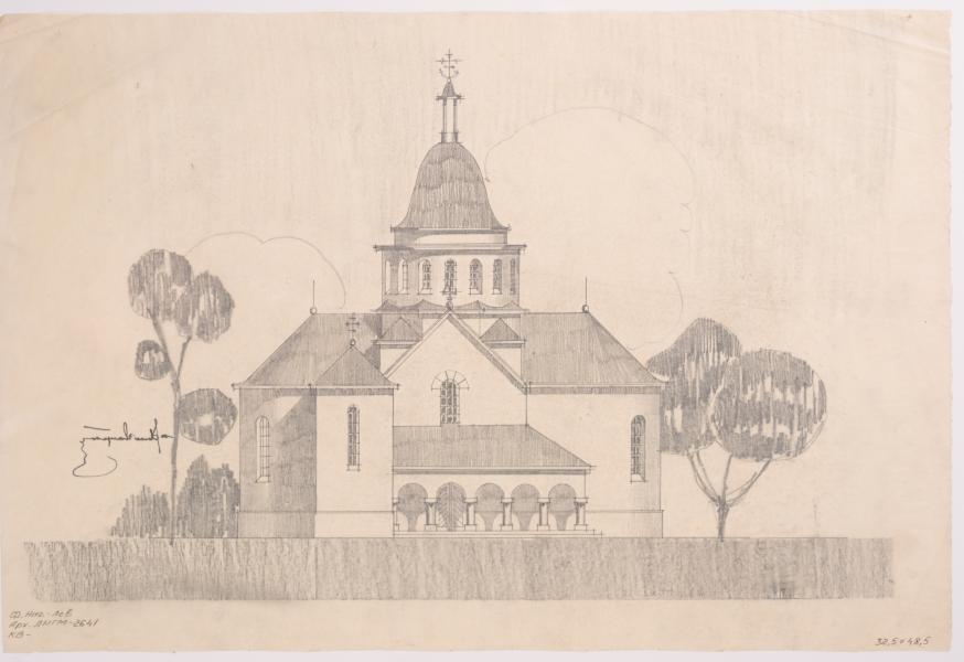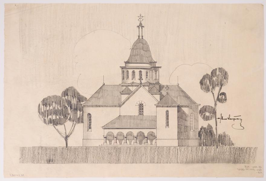 Зображений головний фасад проєктованої церкви. Це мурована тринавова будівля з трьома абсидами, чотиристовпна, трансепт має півциркульні рамена. Вхід до церкви запланований через асиметрично розташований ґанок-аркаду, що зміщений вліво. При головному фасаді справа, у вежичці, розміщені сходи на хори. Над середохрестям здіймається дзвонястий купол на циліндричному барабані. Ця сама церква зображена на кресленнях з інвентарними номерами «ФНаг-Лев-Арх-2642», «ФНаг-Лев-Арх-2643», «ФНаг-Лев-Арх-2644».