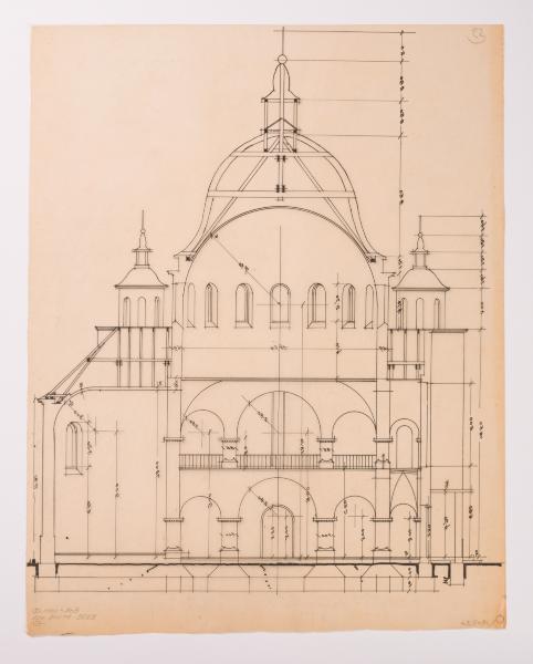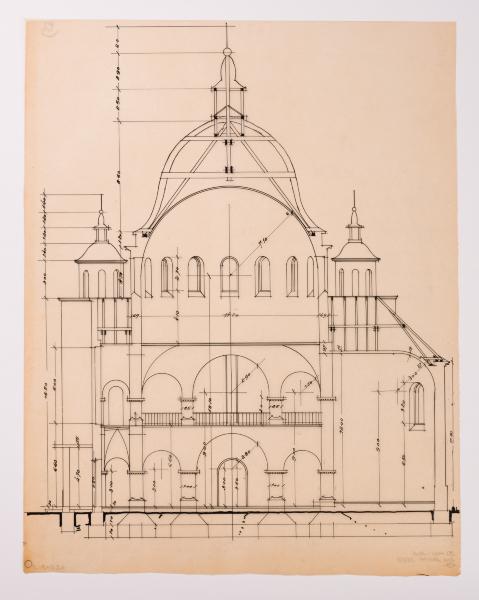 Зображений поздовжній розріз великої мурованої церкви для м. Турка Львівської області, що не був реалізований. Задум церкви виконаний 1927 року, а більшість креслень – 1934-го. У своїй основі будівля має квадратний план та півциркульну абсиду, у внутрішньому просторі є вісім колон, що підтримують великий центральний купол. По кутах будівлі здіймаються ще чотири вежички, завершені дзвонястими банями. З трьох боків будівлі поміж вежами розташовані аркади-присінки з невисокими колонами. Є два варіанти, що різняться декором. На цьому кресленні бані над вежичками спрощені, а вікна центральної бані на барабані вищі та більш видовженої форми (Лев Х., Слободян В., Філевич Н. 100 церков Нагірних. Частина друга: Церкви Євгена Нагірного. Львів, 2015. С. 128).
