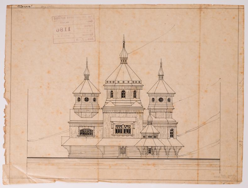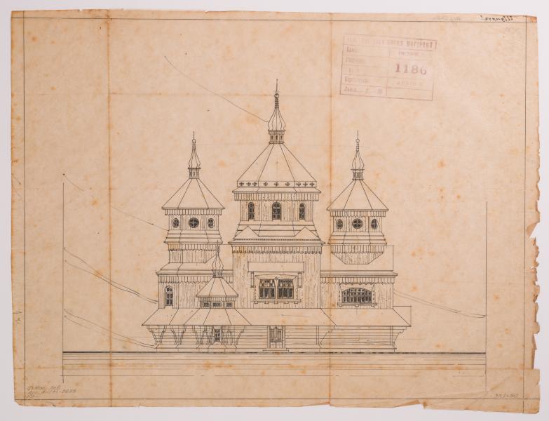 Зображений бічний фасад нереалізованої церкви у селі Шум’яч. Василь Слободян ідентифікує проєкт як виконаний 1927 року. Печатка з номером 1186 та сецесійна манера виконання креслення свідчить про ймовірне накреслення проєкту ще до Першої світової війни. Це тридільна трибанна дерев’яна церква, бані є восьмигранними, з шатровими дахами. Дві гранчасті захристії завершені невеликими восьмигранними вежичками. Крім головного входу з заходу до бабинця, церква має ще вхід чи два з бічних фасадів до нави (Лев Х., Слободян В., Філевич Н. 100 церков Нагірних. Частина друга: Церкви Євгена Нагірного. Львів, 2015. С. 128).