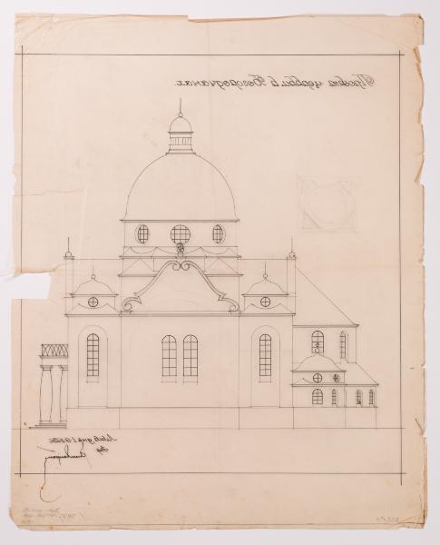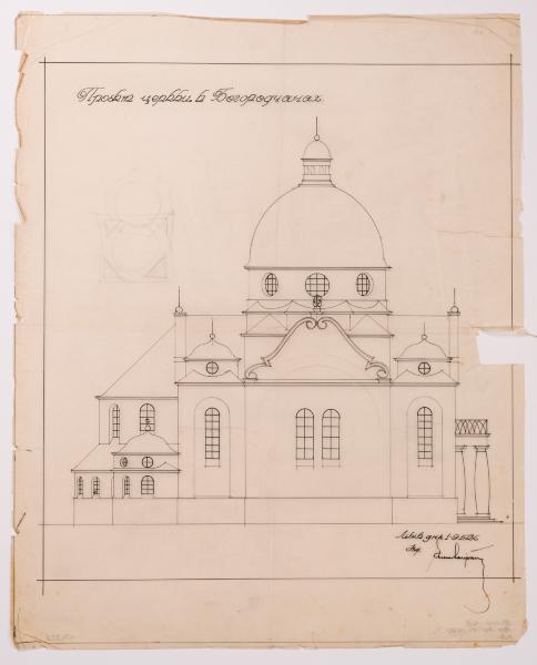 Зліва згори напис тушшю: «Проєкт церкви в Богородчанах»; знизу справа: «Львів 1.9.1926 інж. / підпис / Євген Нагірний».