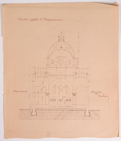 Зображений поперечний розріз з проєкту церкви для Богородчан. Це мурована тринавова будівля з трьома абсидами, чотиристовпна, одноверха. Вхід влаштований через колонний портик, що в рівні другого ярусу завершений балконом. Над середохрестям здіймається півсферична баня, по діагоналях від якої розташовані чотири малі низькі бані. Ще дві аналогічні розташовані над бічними абсидами. У декорі застосований стиль артдеко, що зокрема проявився у криволінійній формі причілків, якими завершені фасади, а також у формі колон. Церква реалізована до 1934 року, сьогодні (станом на 2024 рік) має присвяту Івану Богослову (Лев Х., Слободян В., Філевич Н. 100 церков Нагірних. Частина друга: Церкви Євгена Нагірного. Львів, 2015. С. 125).